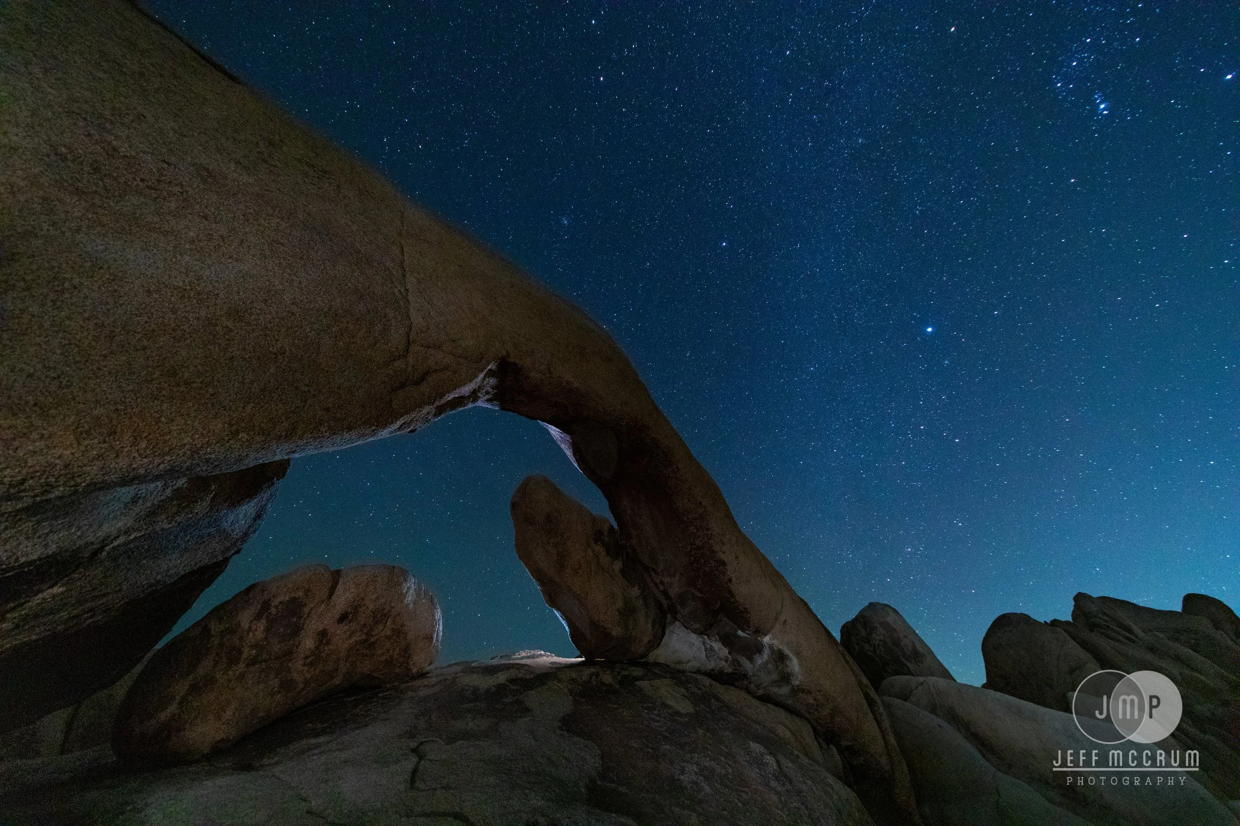 The workshop includes locations that echo the history of the pioneers who came before, as we visit abandoned farms, mills, and mines. Joshua Tree’s history goes back to the Pinto Culture of 8000 BCE, then later Native American tribes, Spanish explorers, Mexicans, fur trappers, cattle rustlers, gold miners, and ranchers. The eponymous Joshua trees come from the higher Mohave side to the west that meets the eastern Colorado Desert and its scrub brush, Cholla cactus, and California’s only native palm, the California fan palm. This clashing of deserts also created geological upthrusts of rock and arches throughout. All of these are perfect for light painting and crafting interesting foregrounds, using handheld lights, remote panel lights, and light orbs.